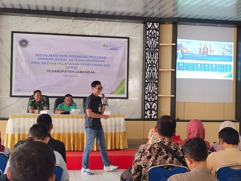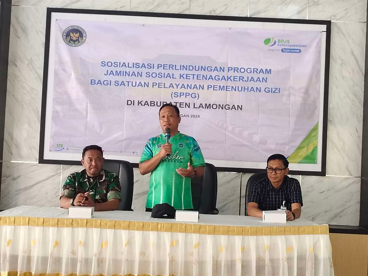 Dalam kegiatan sosialisasi program perlindungan jaminan sosial ketenagakerjaan tersebut dihadiri Kepala Disnaker Lamongan Mokhammad Zamroni, 43 SPPG, para koordinator, pemilik dapur, hingga dari Kodim Lamongan.